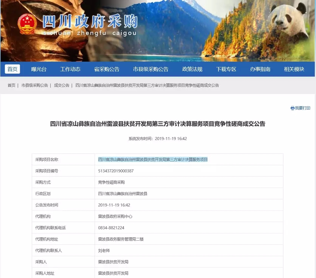 2019年11月19日,“四川省凉山彝族自治州雷波县扶贫开发局第三方审计决算服务项目”(项目名称)进行公开招标,经评标委员会综合评审,确定圣弘建设股份有限公司为本项目第三方审计决算服务中标单位。