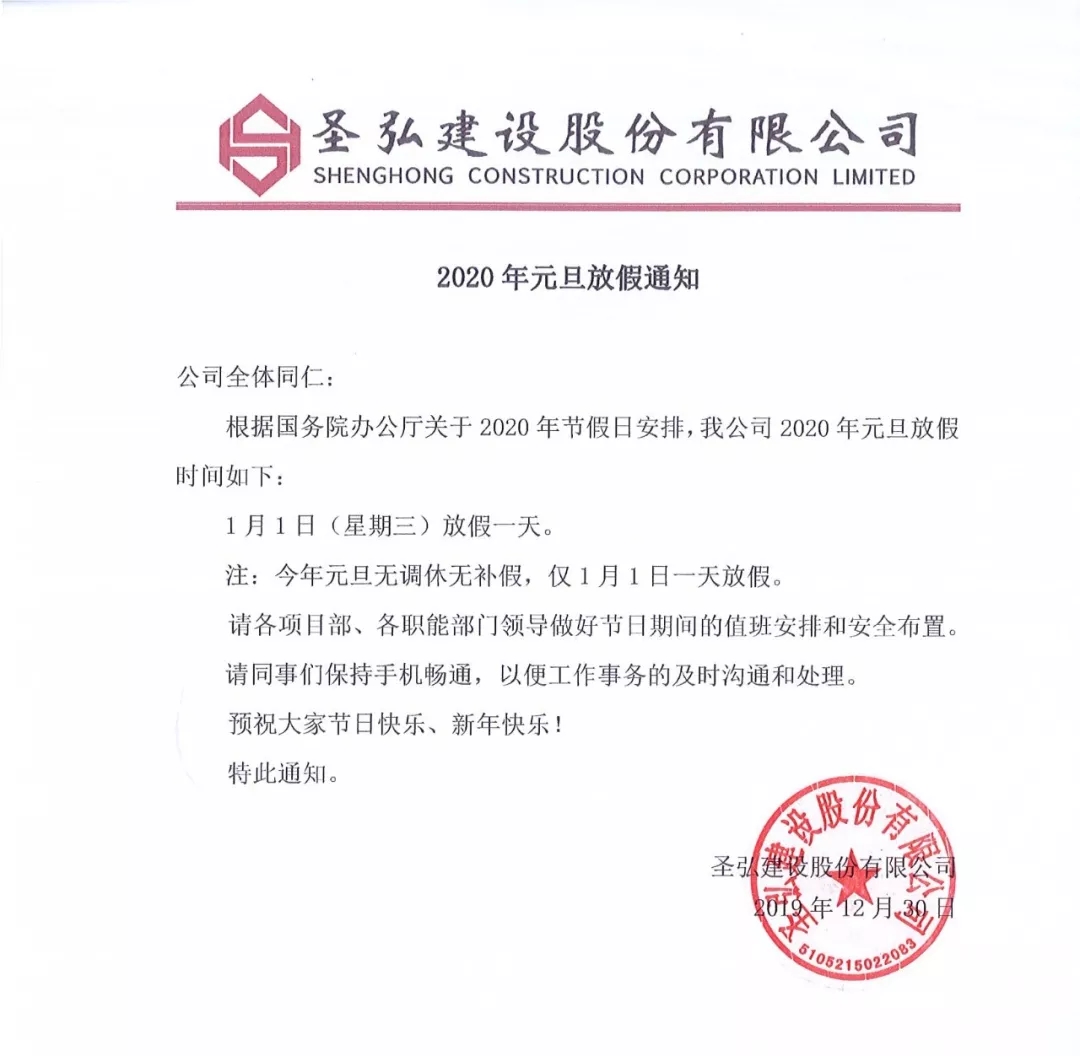 圣弘股份·2020年元旦放假通知
