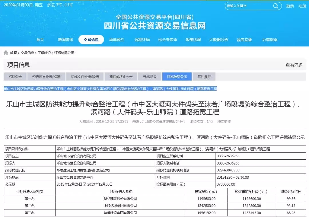 2019年12月25日,“乐山市主城区防洪能力提升综合整治工程(市中区大渡河大件码头至沫若广场段堤防综合整治工程)、滨河路(大件码头-乐山师院)道路拓宽工程”(项目名称)进行公开招标,经评标委员会综合评审,确定圣弘建设股份有限公司为本项目工程监理中标单位。