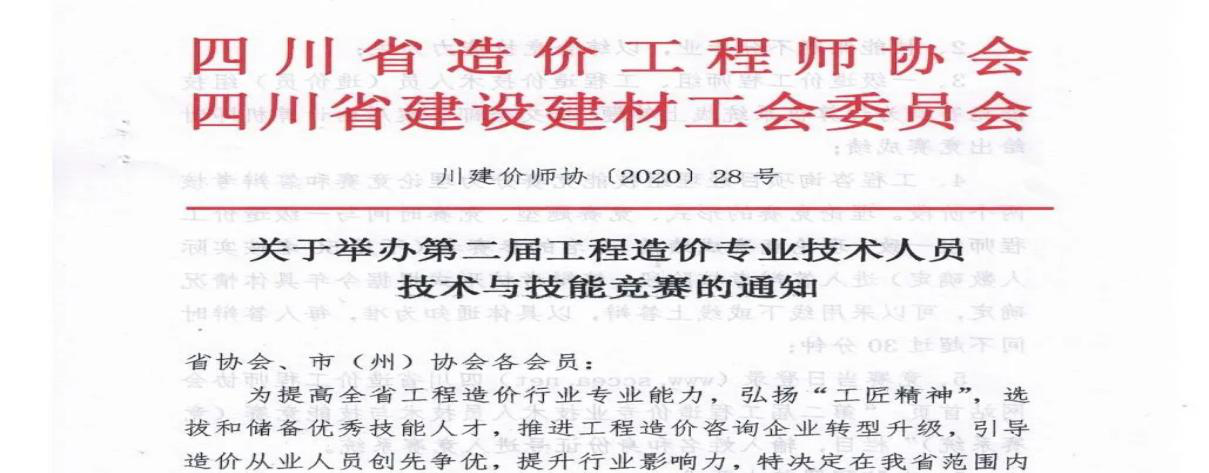 此次由四川省造价工程师协会、四川省建设建材工会委员会于2020年8月25号发布的关于举办第二届工程造价专业技术人员技术与技能竞赛的通知(川建价师协[2020]28号)