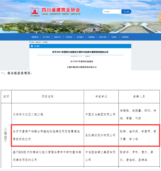 2021年12月,在四川省建筑业协会举办的2021年度四川省建设工程BIM应用大赛中,我司参赛项目“自贡市富荣产城融合带基础设施建设项目智慧建造管控系统应用”在众多央企和地方国企参赛单位中脱颖而出,荣获综合组三等奖。 该赛事是省内BIM技术方面最具影响力的重要赛事,也是积极响应“推进BIM、智慧化建造发展”等国家规划和加强项目管理企业、工程施工企业信息化建设和数字化能力建设的重要平台。