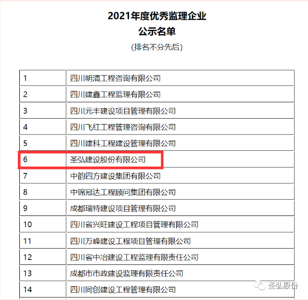 2022年12月7日,成都建设监理协会发布了“2021年度优秀监理企业”及“2021年度示范项目监理机构”评选结果的公示,圣弘建设股份有限公司被评为“2021年度优秀监理企业”。