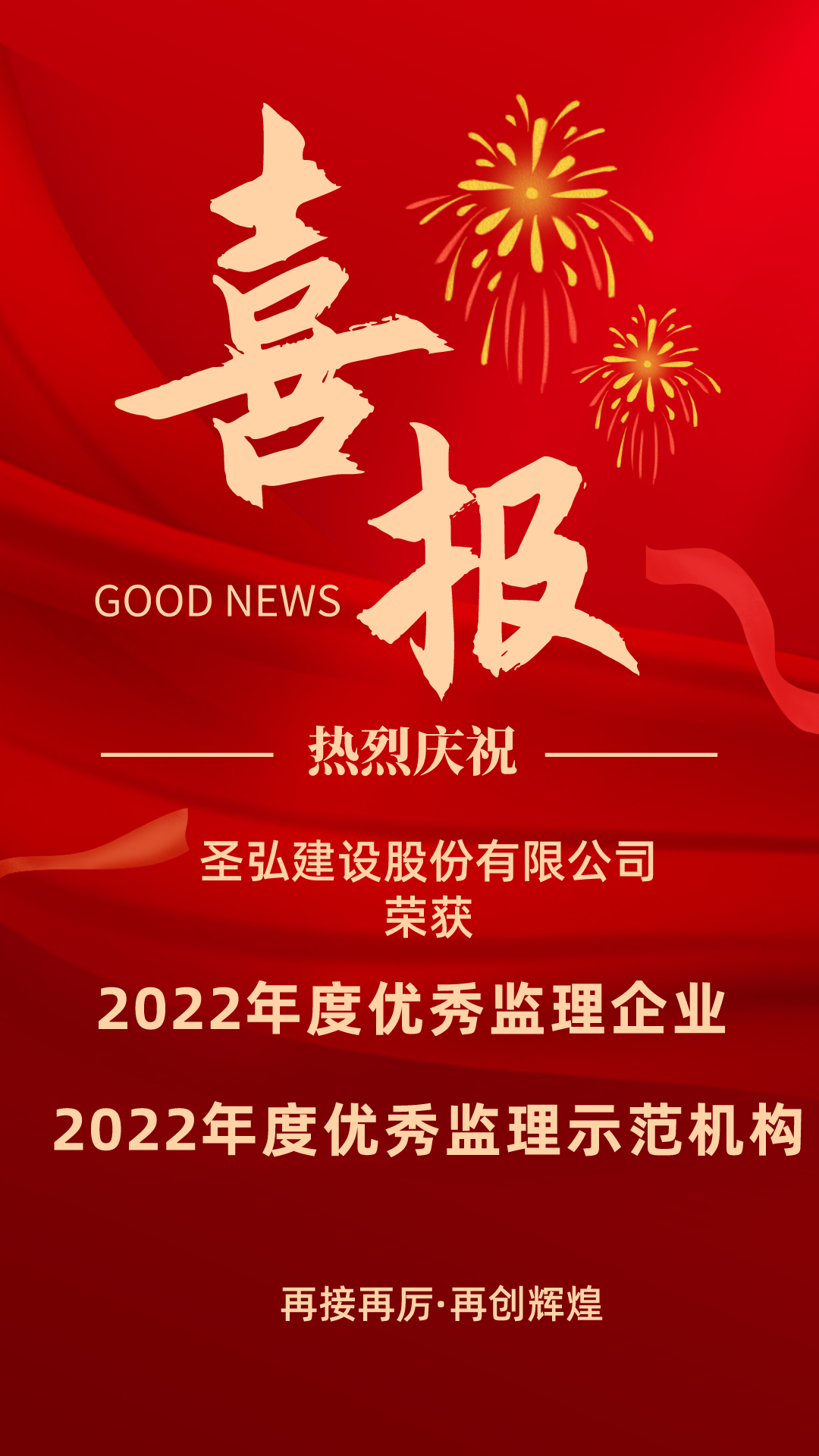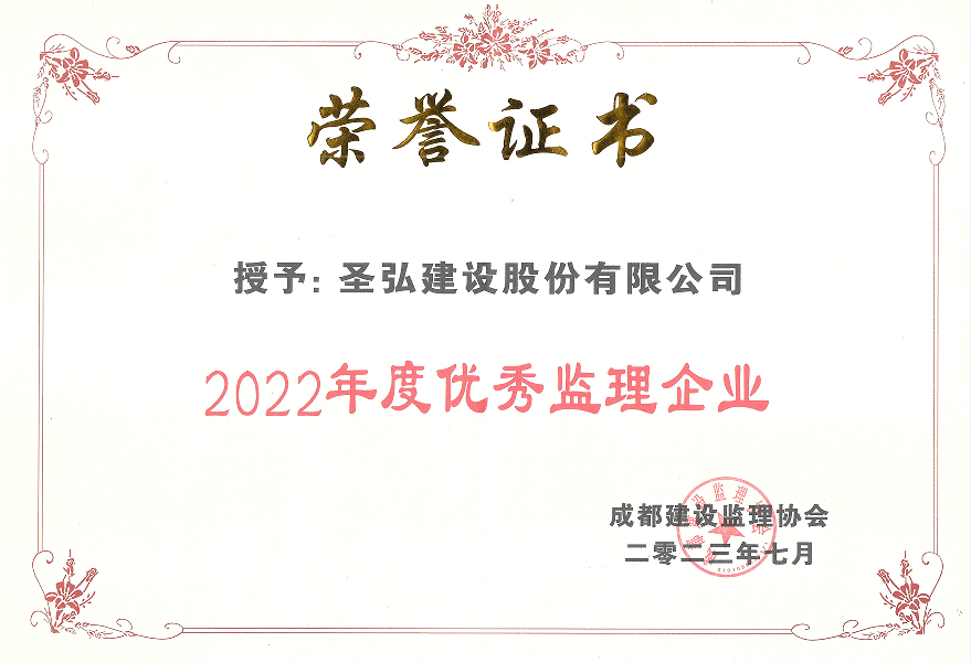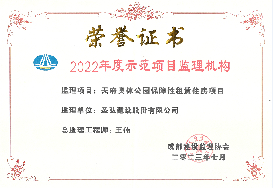 2023年7月3日,成都建设监理协会发布了“2022年度成都市建设监理行业优秀监理企业”及“2022 年度示范项目监理机构”评选结果的公示,圣弘建设股份有限公司被评为“2022年度优秀监理企业”,同时我司监理项目天府奥体公园保障性租赁住房获“2022年度示范项目监理机构”荣誉称号。