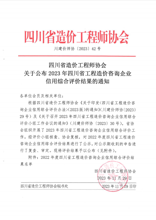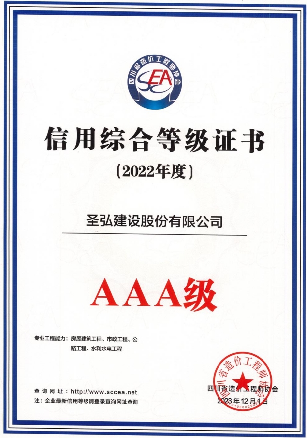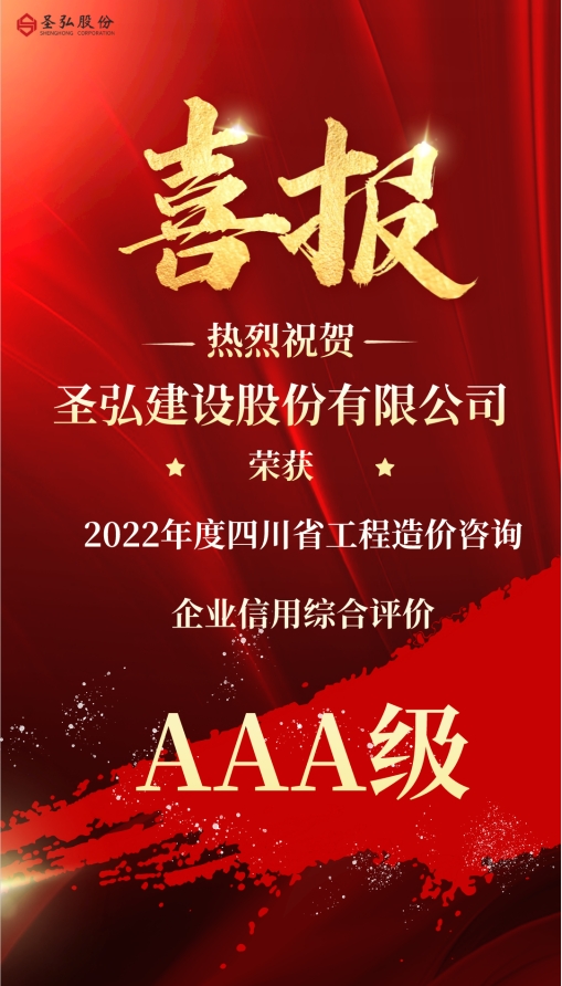 11月29日,四川省造价工程师协会发布2022年度四川省工程造价咨询企业信用综合评价结果公示,圣弘建设股份有限公司荣获2022年度四川省工程造价咨询企业信用综合评价AAA级。