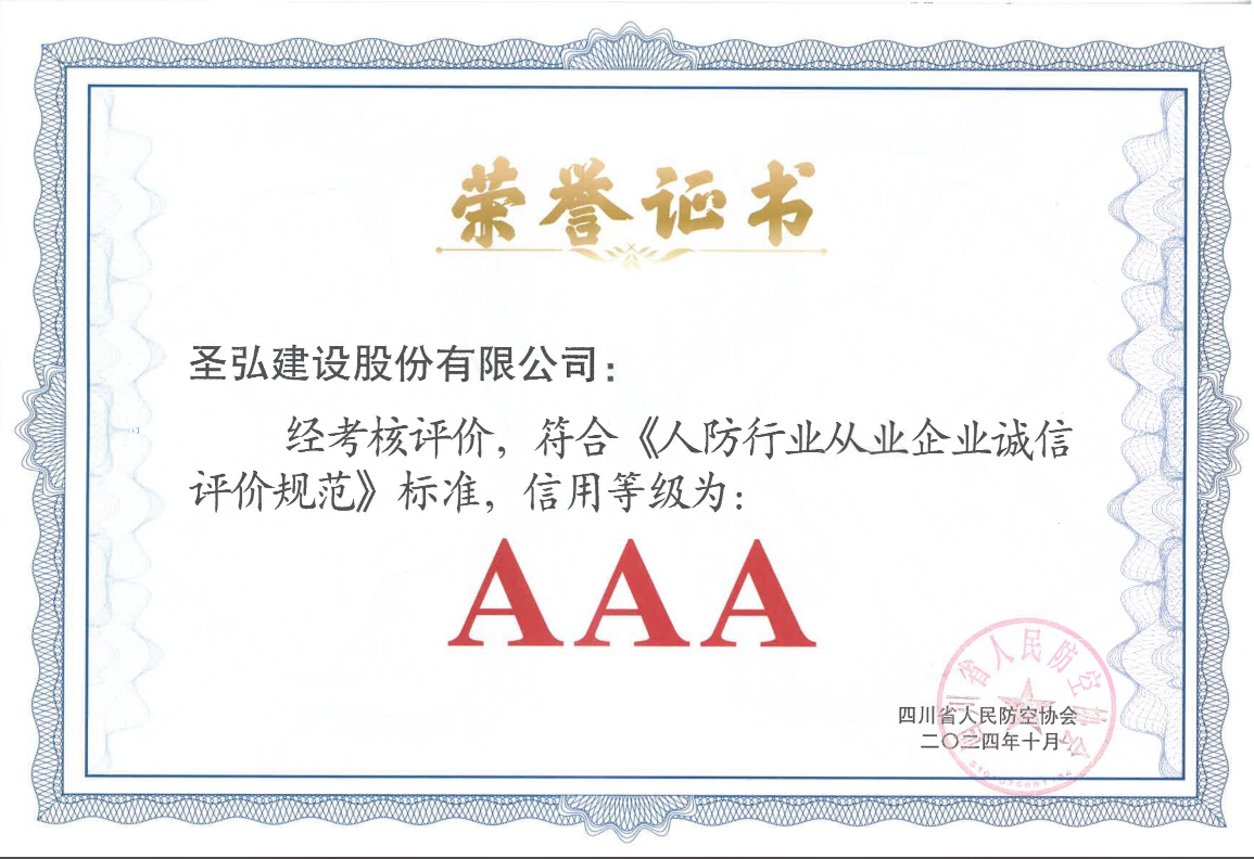 2024年8月四川省人民防空协会发布了关于开展2024年度人防工程监理企业会员(单位)诚信评价结果的公示,圣弘建设股份有限公司荣获四川省人民防空协会的“2024人防监理AAA企业”称号